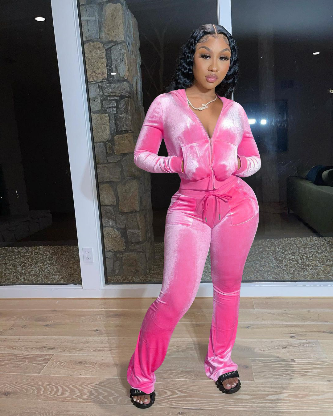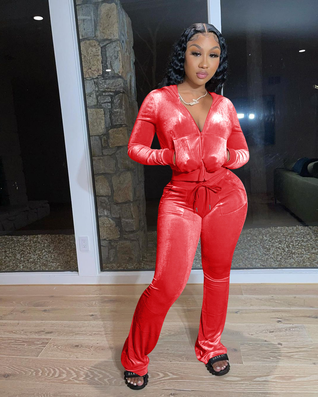 Velvet Hooded Sweatshirt And Wide Leg Pants